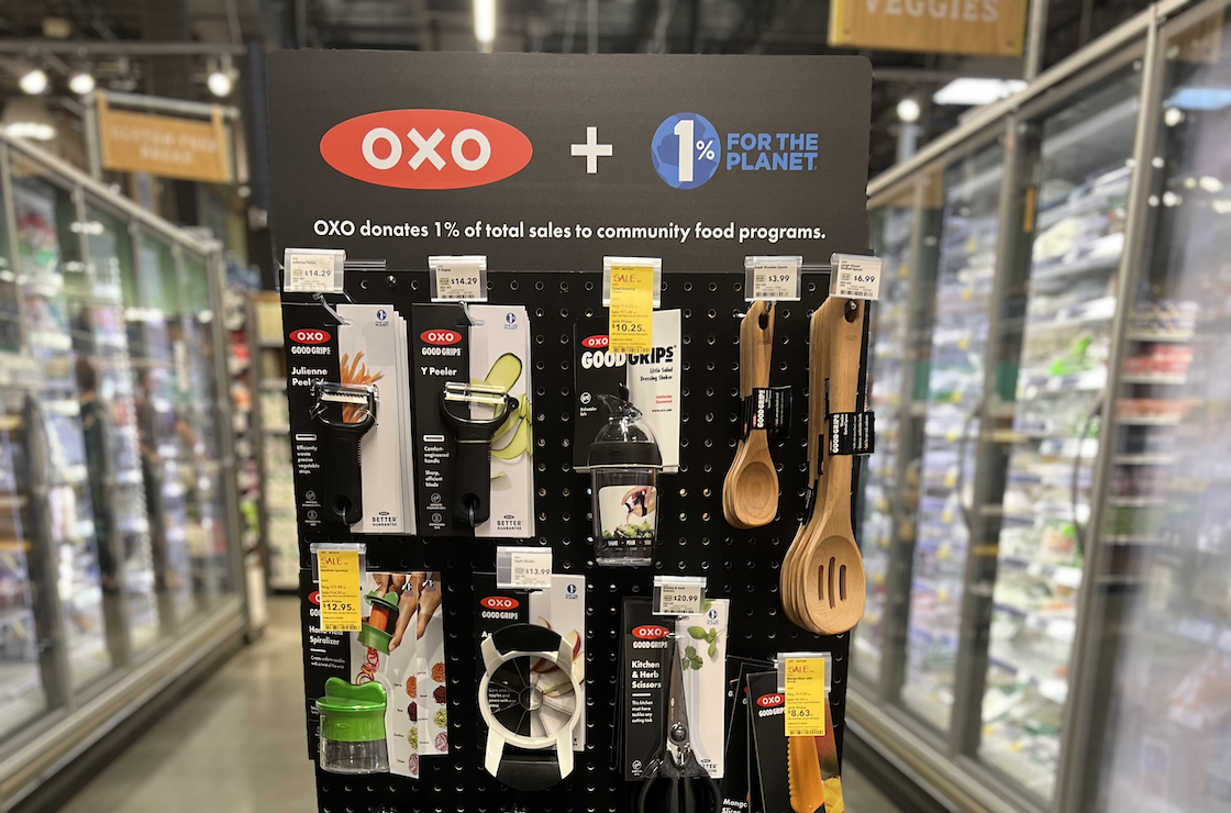 Integrating the 1% for the Planet logo (and the storytelling around it) on product packaging, labels, in-store displays, and D2C checkout carts is a strong way to consistently and simply signal your commitment to your customers. For its Whole Foods retail display, OXO leveraged the logo and a straightforward, clear description to quickly and effectively convey its impact to shoppers.